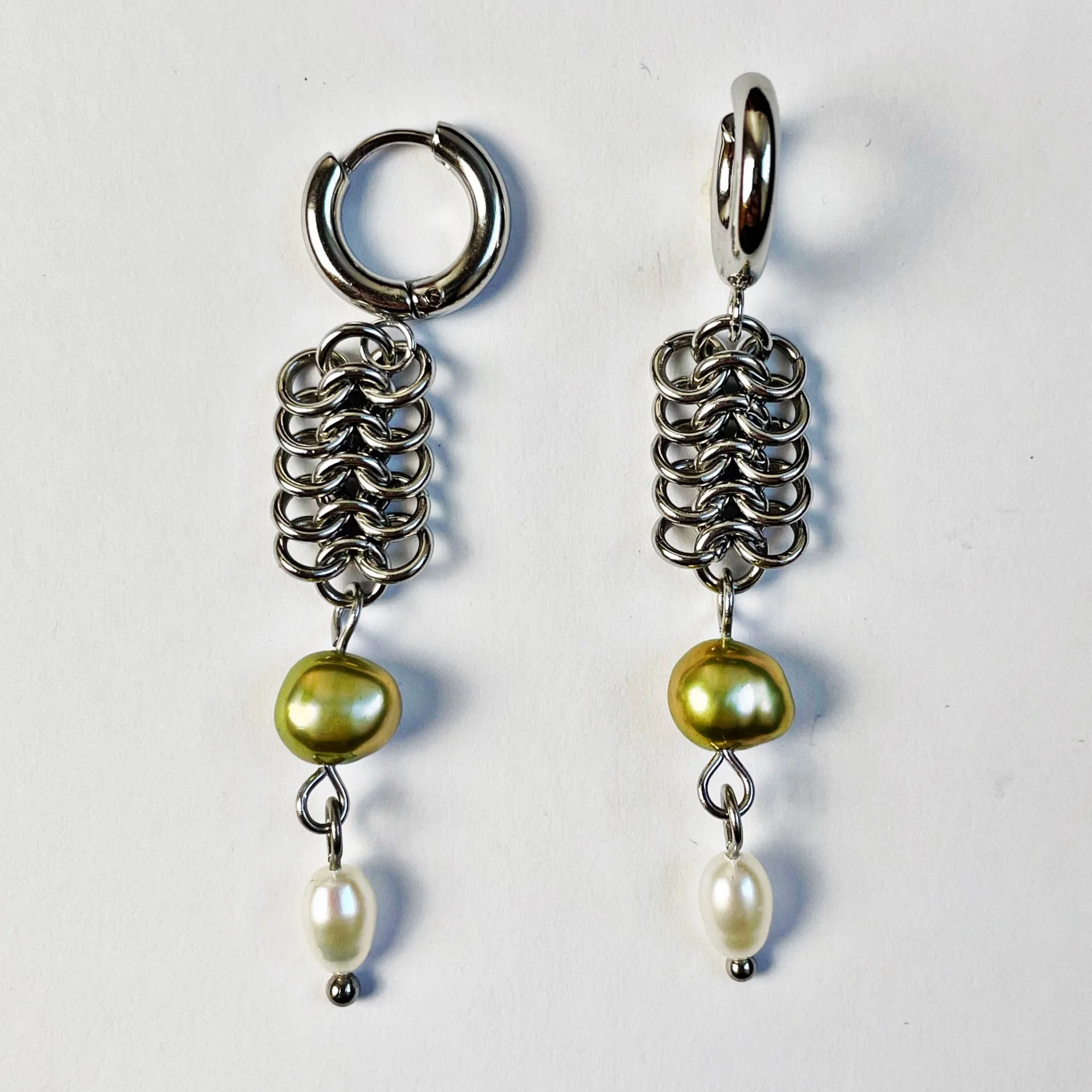 stainless steel hoops, freshwater pearls, stainless steel chainmaille and findings
