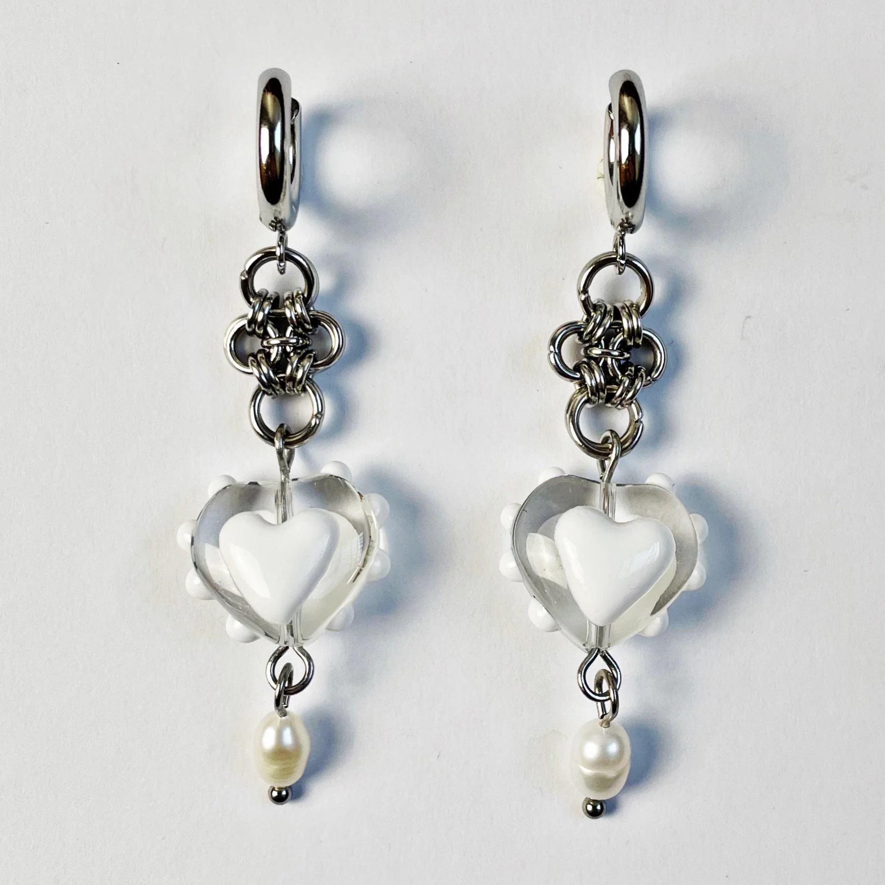 stainless steel hoops, freshwater pearls, glass beads, stainless steel chainmaille and findings