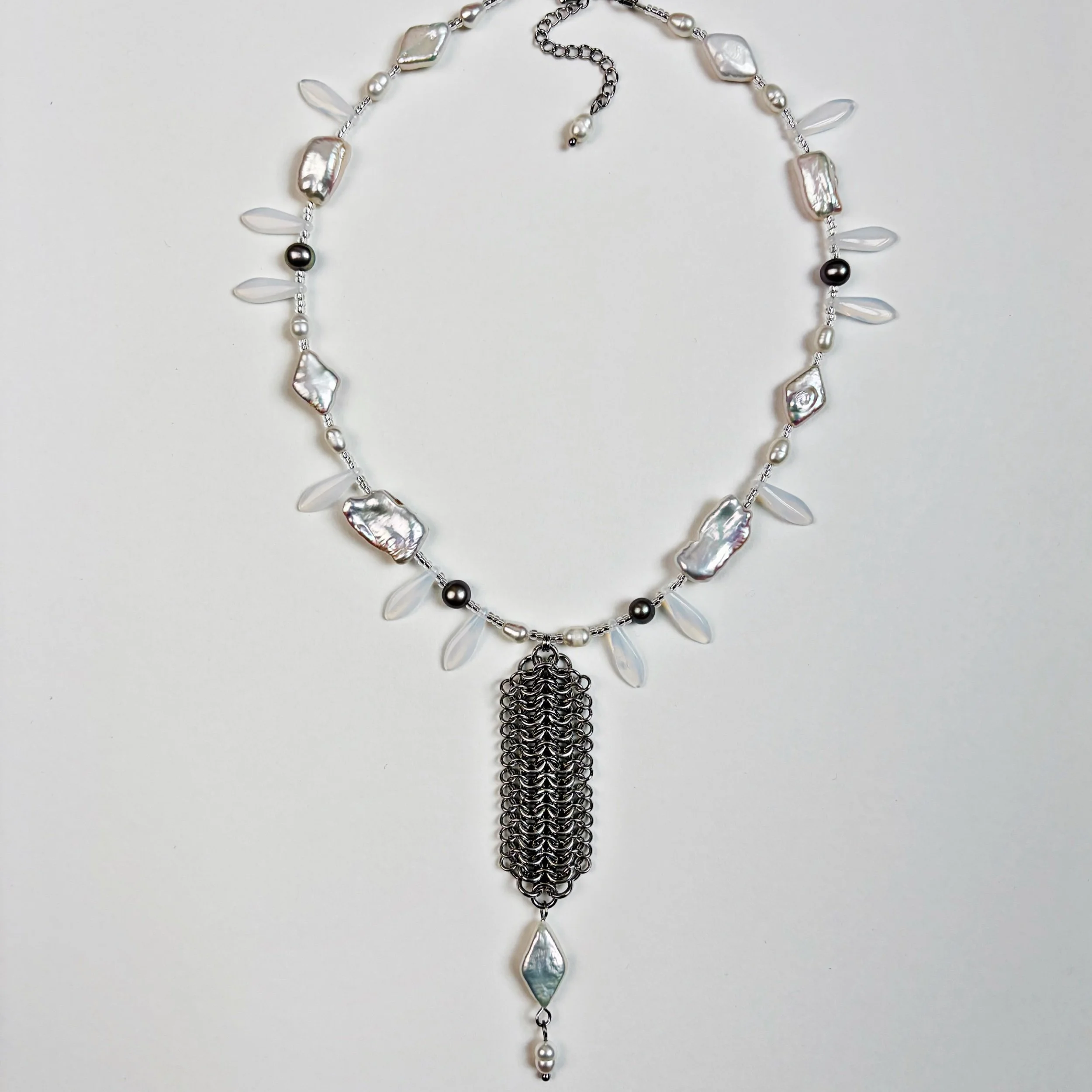 stainless steel chainmaille pendant, freshwater pearls, glass beads and stainless steel findings