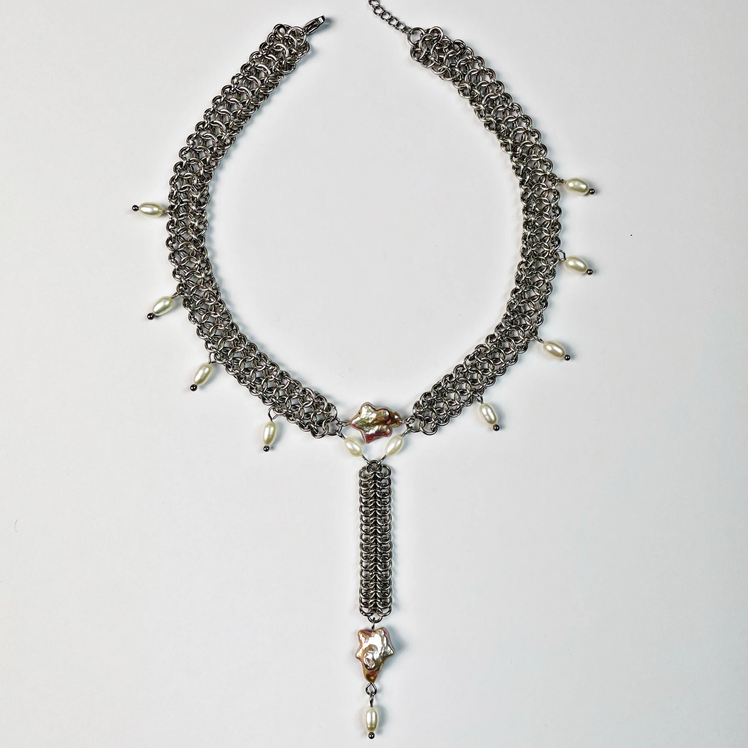 stainless steel chainmaille, freshwater pearls and stainless steel findings. 13.5inches plus 2 inch extender chain - choker style