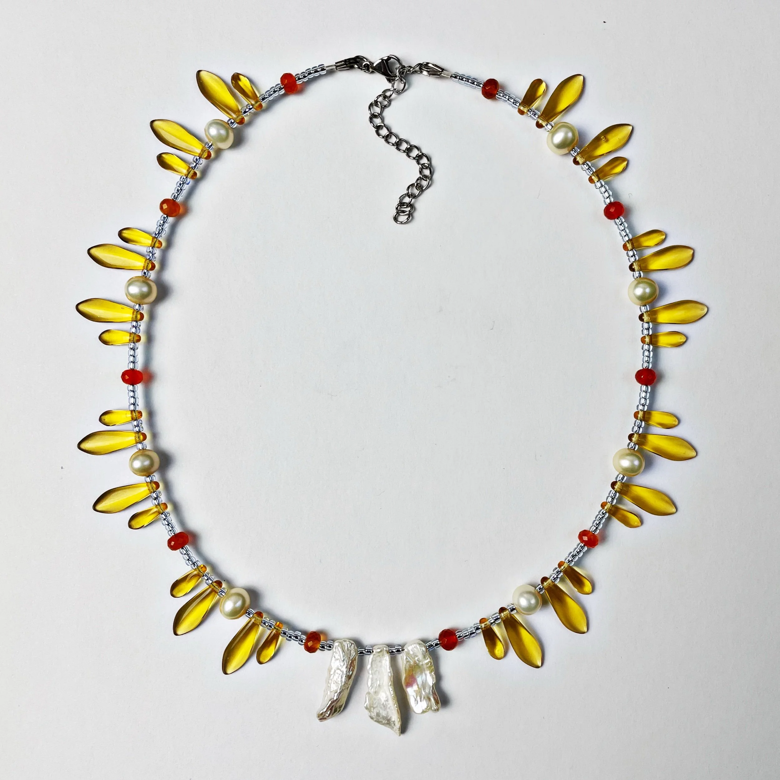 freshwater and keshi pearls, glass beads, carnelian and stainless steel findings